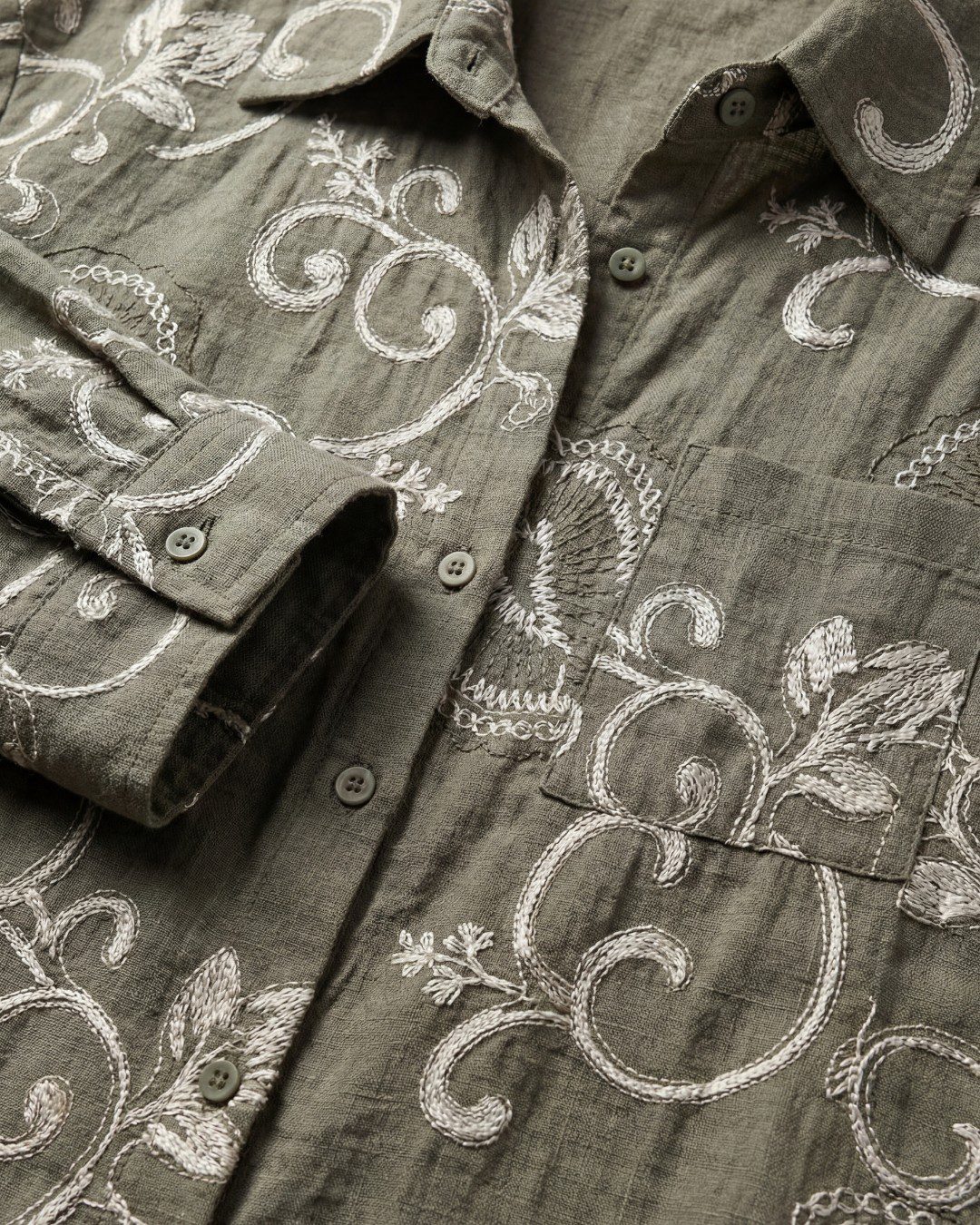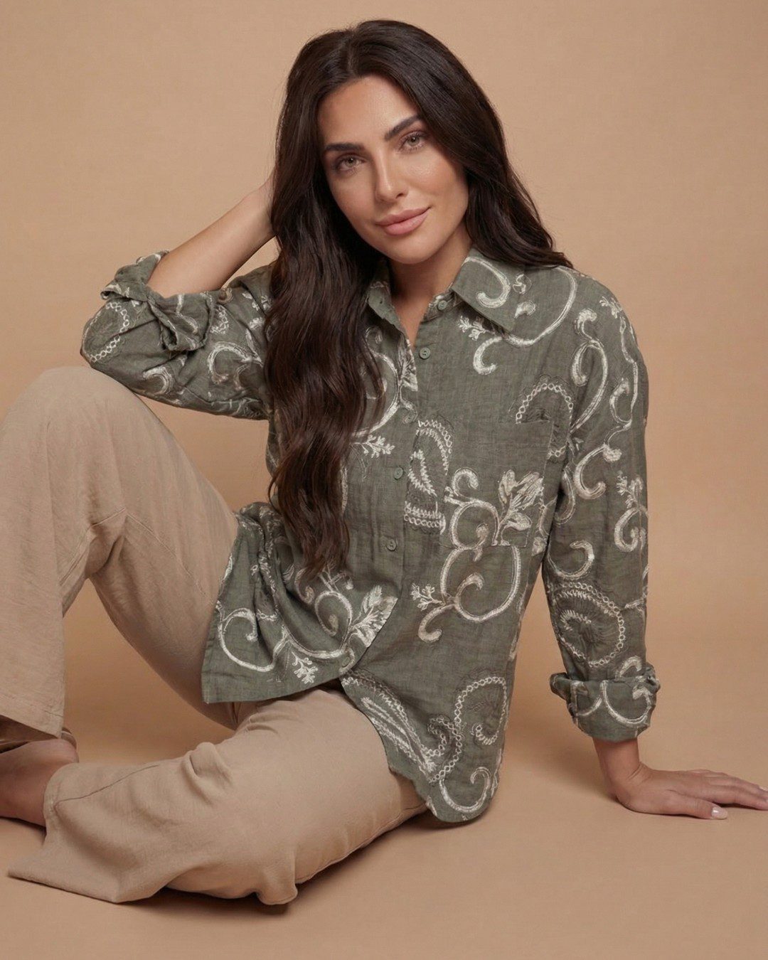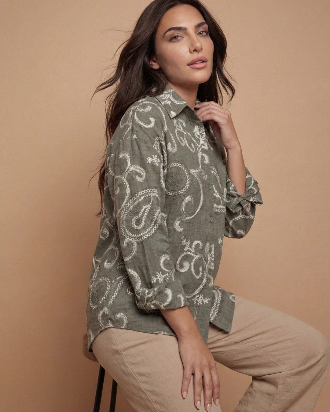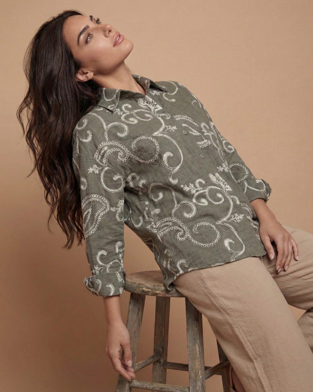 Ένα πουκάμισο που μιλά μόνο του. Φτιαγμένο από 100% βαμβάκι με υφή που αγγίζει απαλά το δέρμα, διακοσμημένο με χειροποίητα κεντήματα σε μοτίβο paisley που του δίνουν έναν αέρα bohemian κομψότητας.