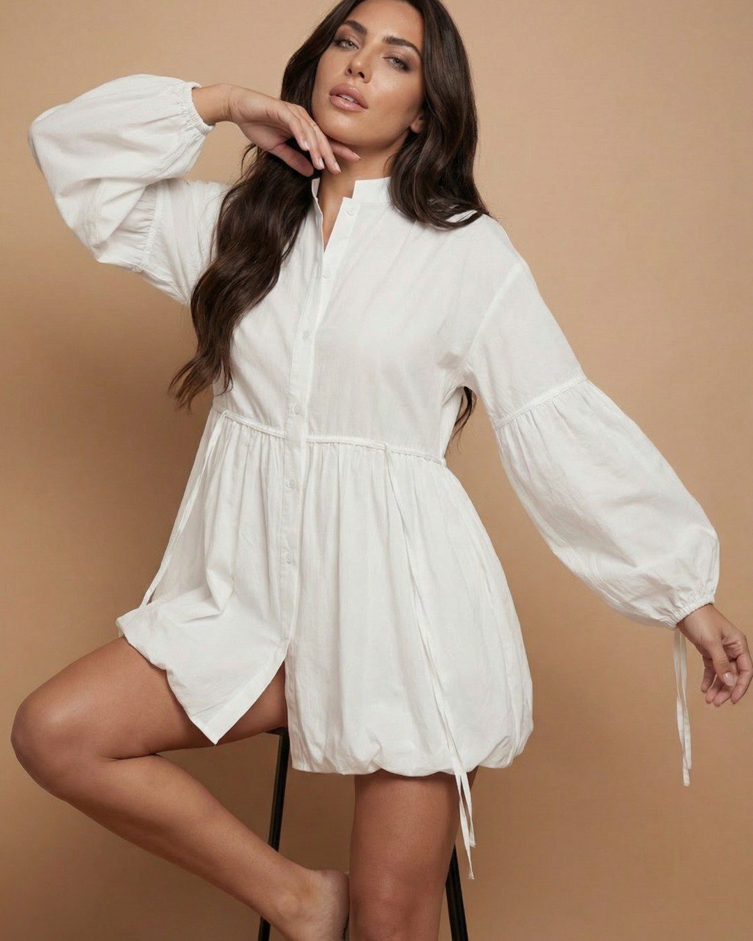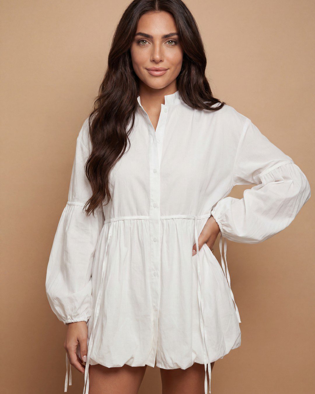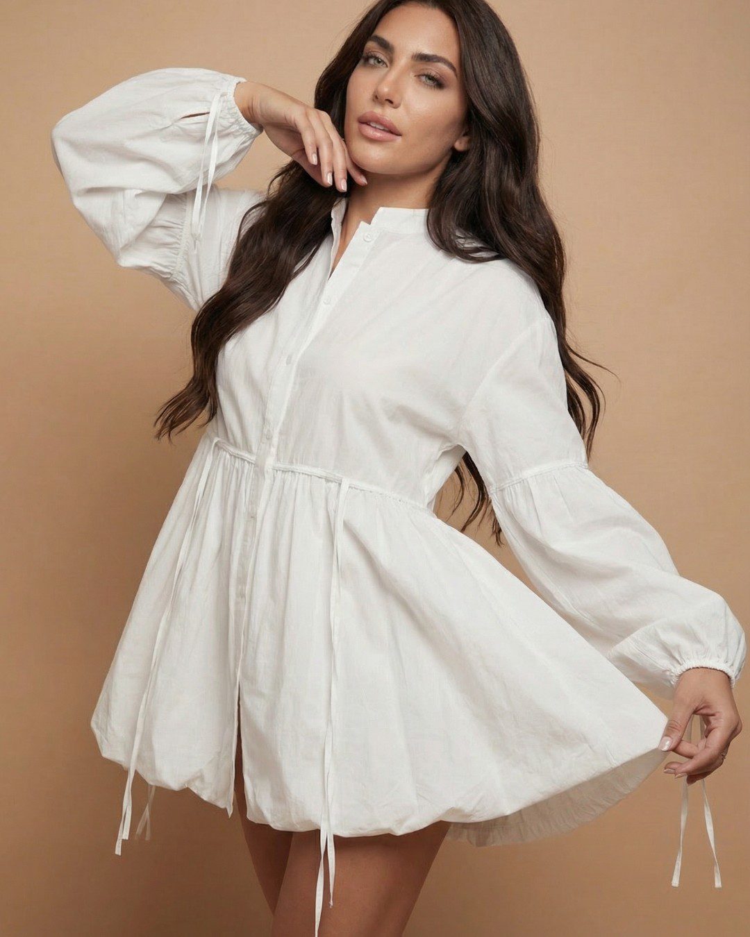 Η balloon γραμμή του στο κάτω μέρος δημιουργεί έναν playful όγκο που ταυτόχρονα καλύπτει και κολακεύει, ενώ η empire μέση ορίζει το σιλουέτ χωρίς να το σφίγγει. Τα φουσκωτά μανίκια με λεπτά κορδόνια στους καρπούς και στο τελείωμα προσθέτουν μια λεπτομέρεια που κάνει τη διαφορά.