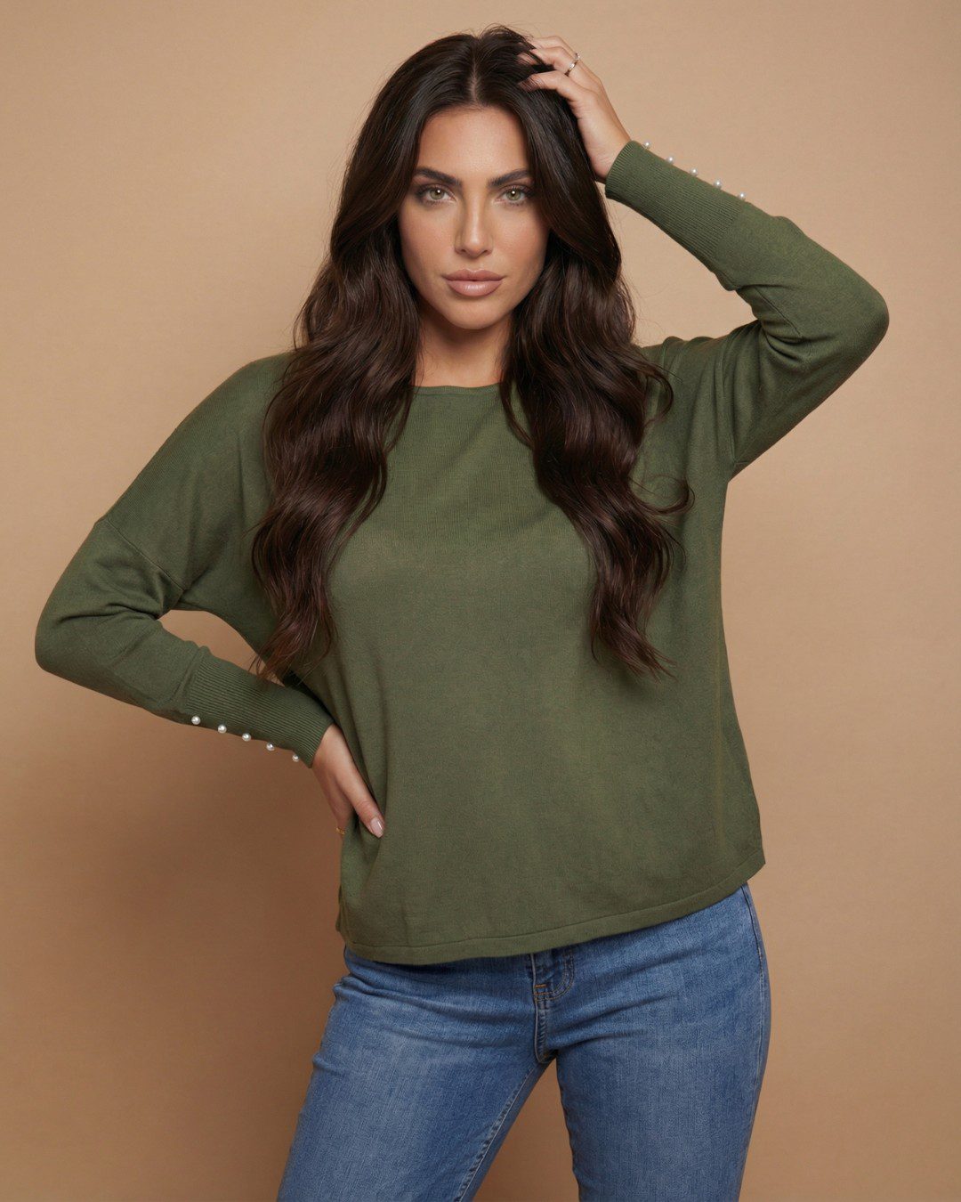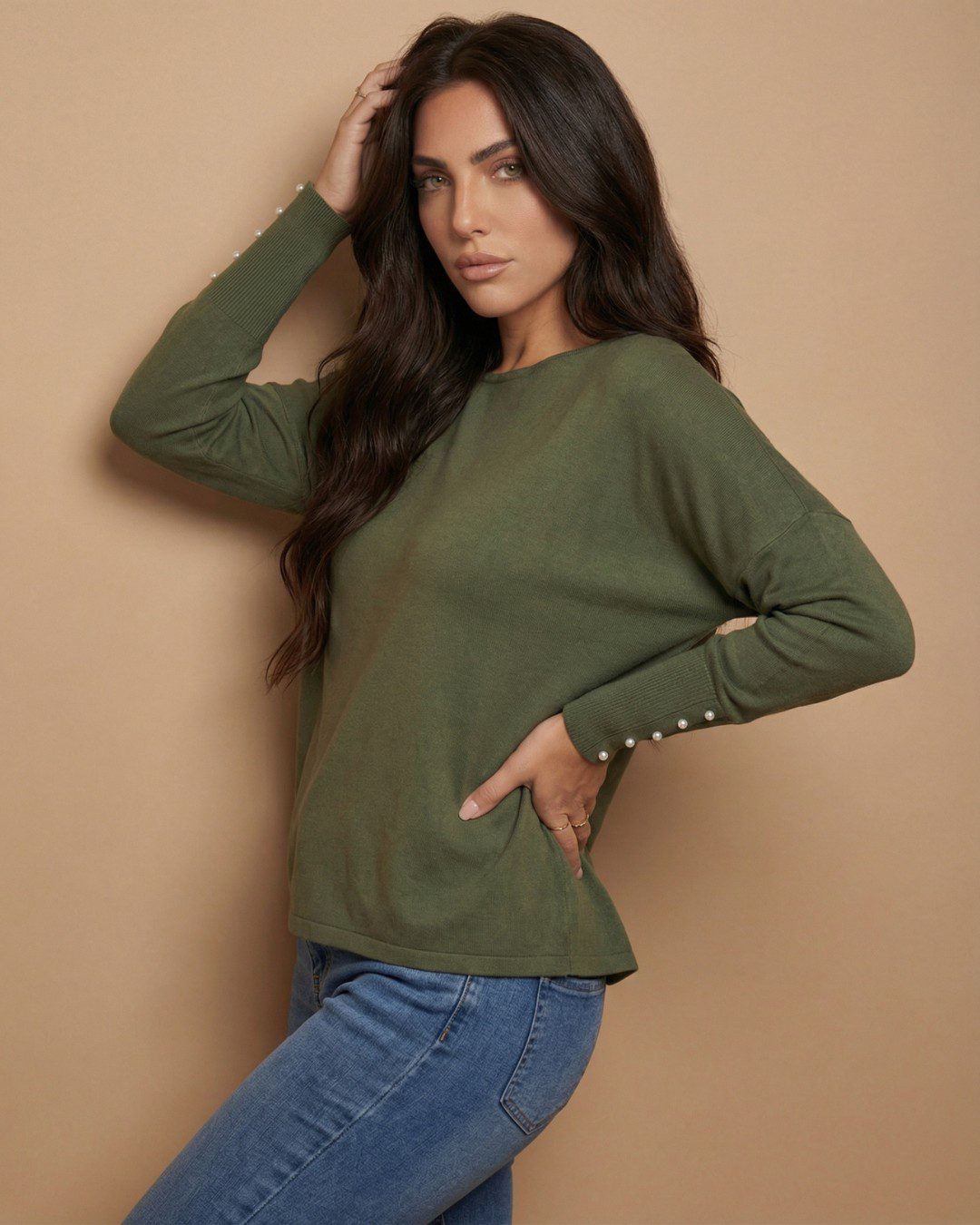 • Μακριά μανίκια με διακοσμητικά κουμπιά-πέρλες