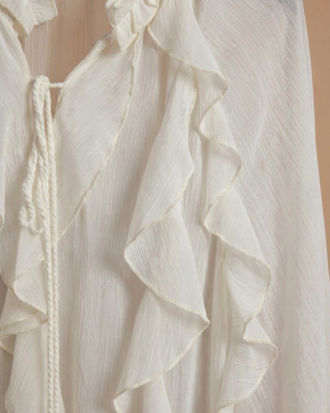 Το ημιδιαφανές ύφασμα chiffon πέφτει ρευστά στο σώμα, αποκαλύπτοντας με χάρη και μυστήριο. Τα καταρράκτες από βολάν που τρέχουν σε όλο το μπροστινό μέρος δημιουργούν ένα dramatic, romantic αποτέλεσμα, ενώ το ruffle τελείωμα στον λαιμό προσθέτει ένα vintage, Victorian άγγιγμα. Το λεπτό κορδόνι με tassel στο τελείωμα δίνει την τελική πινελιά στυλ που κάνει τη διαφορά.